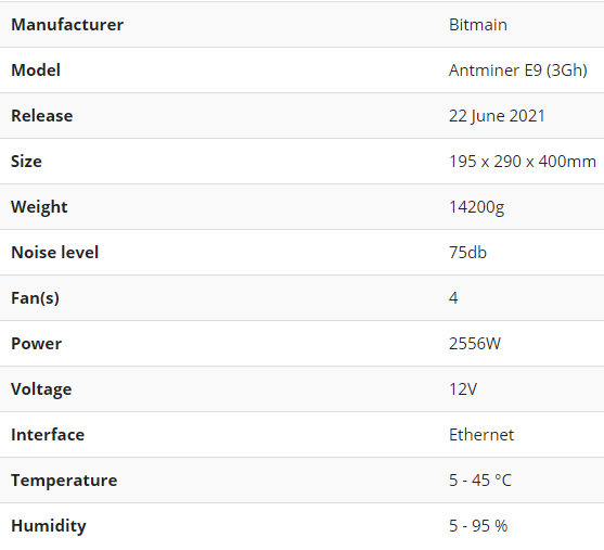 Antminer E9 miner with a maximum hash rate of 3 GH/s at 2556 W power consumption.